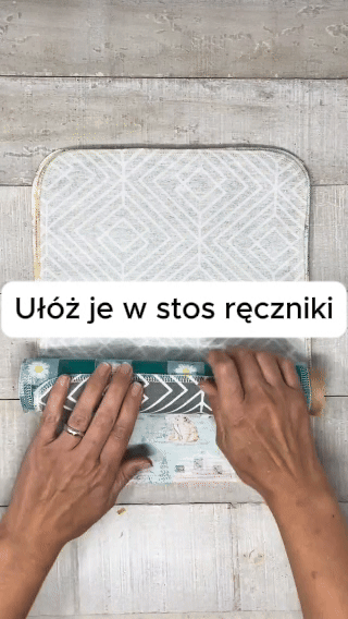 Jak widać na zdjęciu, zwijaj je stopniowo – każda kolejna ściereczka naturalnie „przykleja” się do poprzedniej, tworząc spójny rulon.